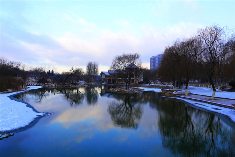 雪后,静河,多彩天空,水中倒影,构成一幅优美画卷。拍于潍坊植物园
