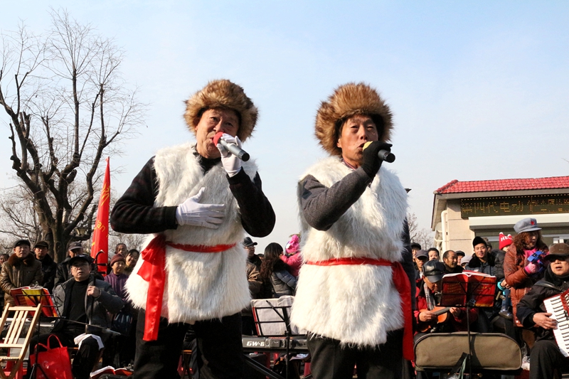 济南英雄山下每逢双休日,英雄山合唱团引来众多人参加大合唱,这是两位年过六旬的老人在化装演唱。