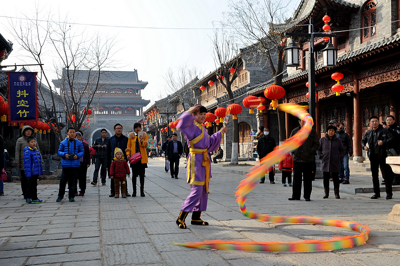 青州市2015年新春群众文化活动丰富多彩,这是民间传统项目抖空竹在古城区展演的情形。为了表现效果,用1/30秒的速度拍摄,使表演者手中的空竹彩带演变成金蛇舞动,动感很强。