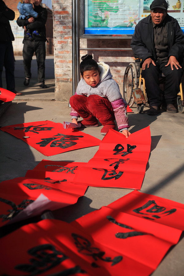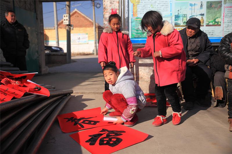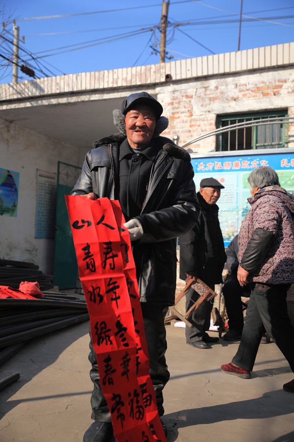 济宁市鱼台县王庙镇旧城里村的村民,得到了本县书法家现场书写的春联,喜上眉梢,一边晾晒,一边欣赏 。