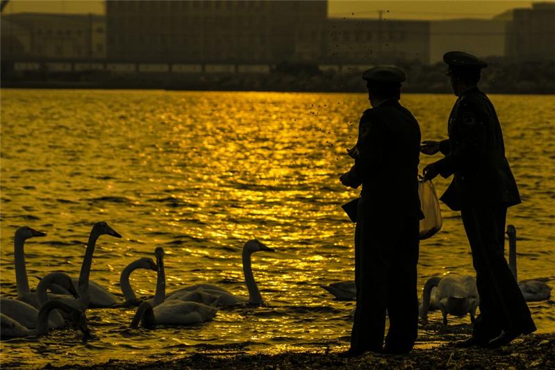 春节前,威海荣成俚岛边防派出所的民警来到烟墩角天鹅湖,查看大天鹅生活情况,并投食喂养大天鹅,确保大天鹅平安过冬。