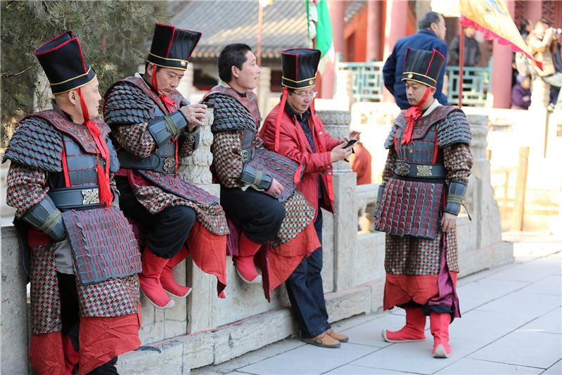 拍摄于泰安岱庙,在岱庙的封禅大典间隙,几位扮演古代侍卫的演员没来得及脱下古装就开始玩手机了,活生生一副穿越范