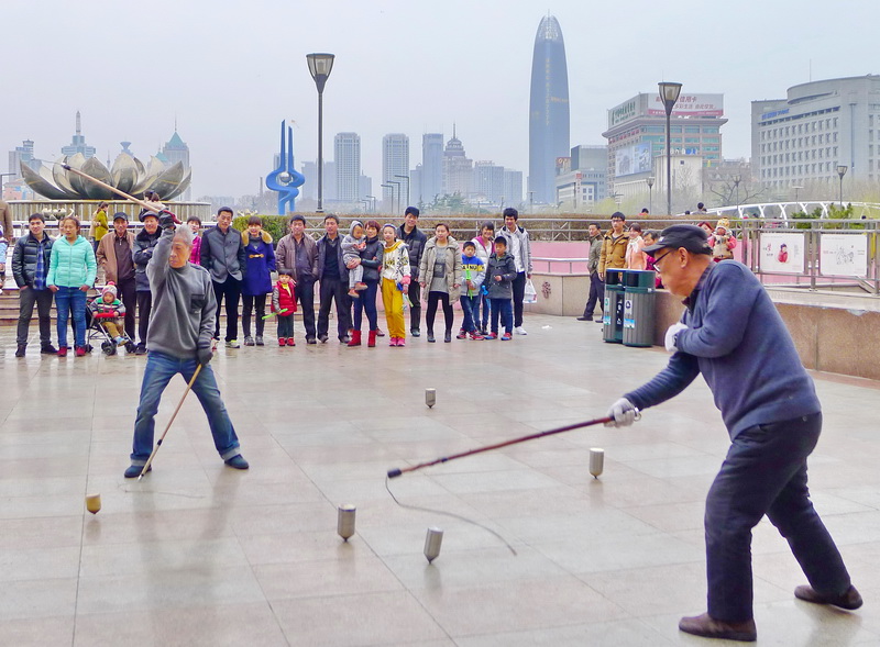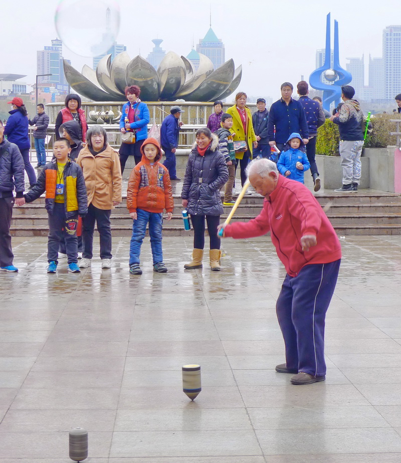背影看去,王大爷像位老教练,一身运动服上红下蓝。二五后的他,今年90整。他每天会骑着自行车改制的小三轮来到济南的市中心《泉城广场》。他的小三轮上全是宝贝:有空竹,有陀螺(济南人叫老牛)、鞭子、风筝等等(我叫不上名的好东西)。看他抽老牛的劲,我说这里边有巧劲啊。他说:“嗯,还得有横劲才行”。他的说法太爷们了,真让我五体投地。记得他说:头疼脑热感冒发烧,只要来广场活动一下,就没啥事了。在这一起活动的大都是退休的老爷们,祝他们开心,祝他们健康!