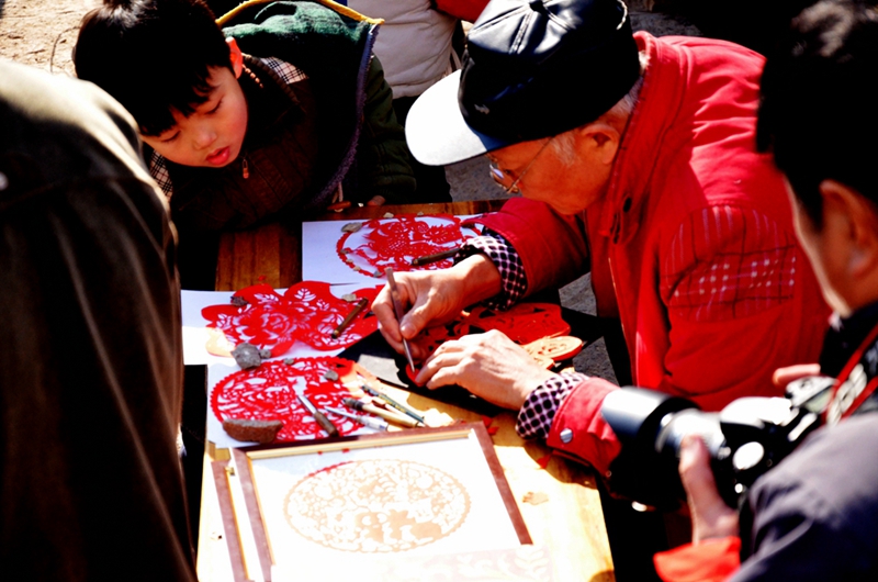艺术有感染力,还有吸引力,这个小男孩被春节表演的剪纸艺术家精湛的艺术所吸引。