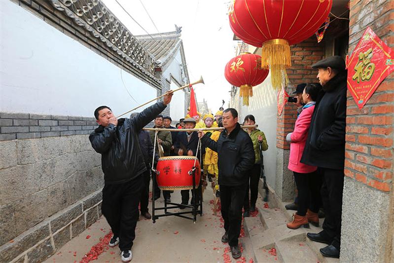 招远风俗,民间自发成立的吹鼓乐队到大户门口祝贺新春