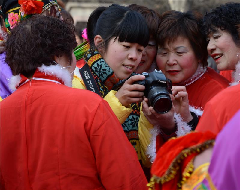 2015年3月5号,在扮玩空隙几位大妈在看摄影师给她们拍摄的照片。
