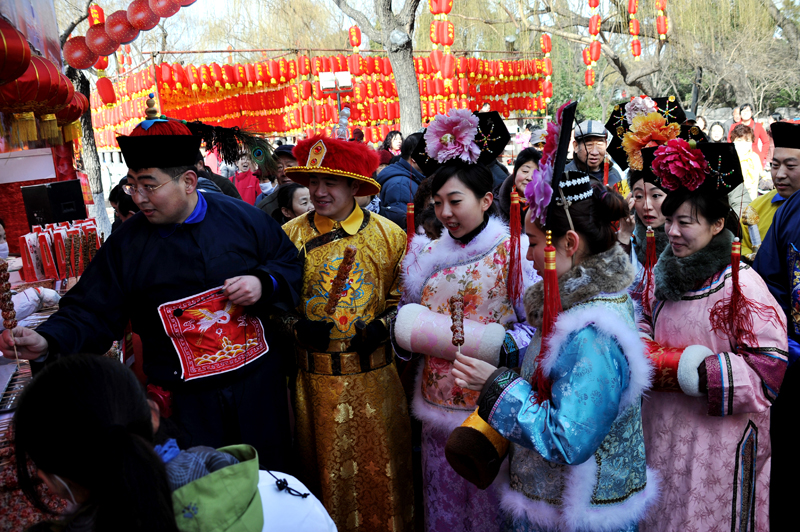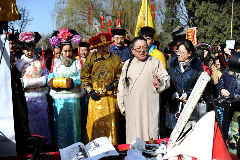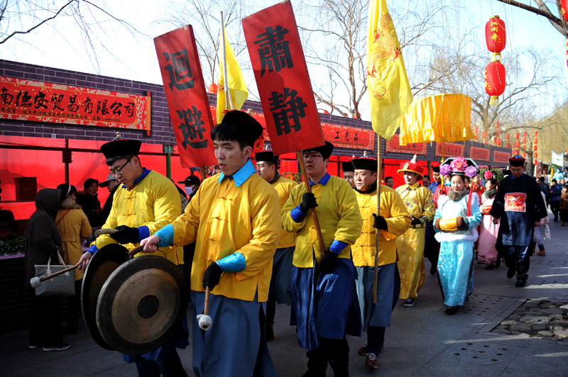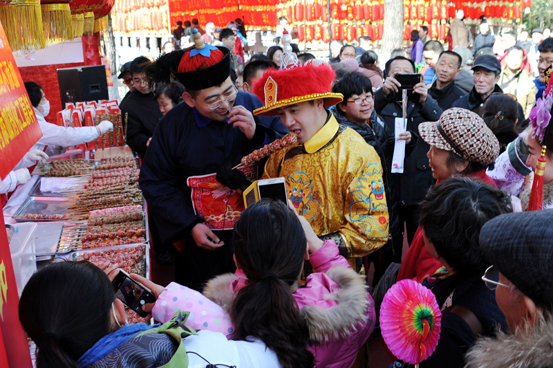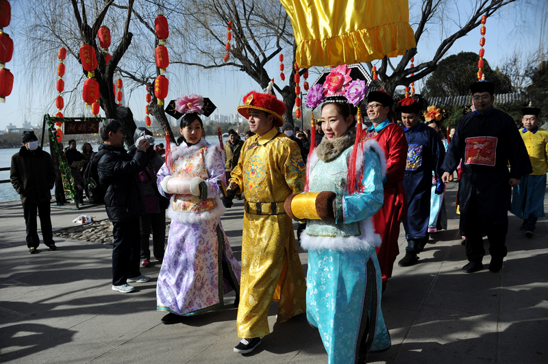 羊年大明湖春节文化庙会除了有外国舞蹈、舞狮、高跷、盘鼓等演出,新编情景剧《乾隆迎宾》成为庙会活动的亮点。由景区员工扮演的乾隆皇帝、还珠格格、紫薇格格等人物巡游大明湖,演绎全新的夏雨荷故事,并与游客互动,吸引了大家的目光,场面好不热闹。
