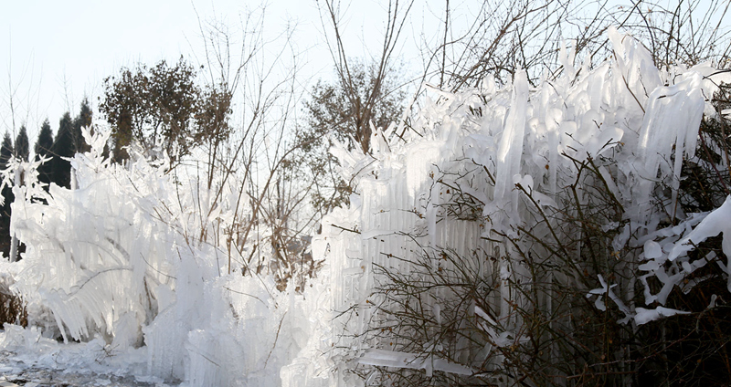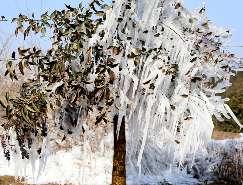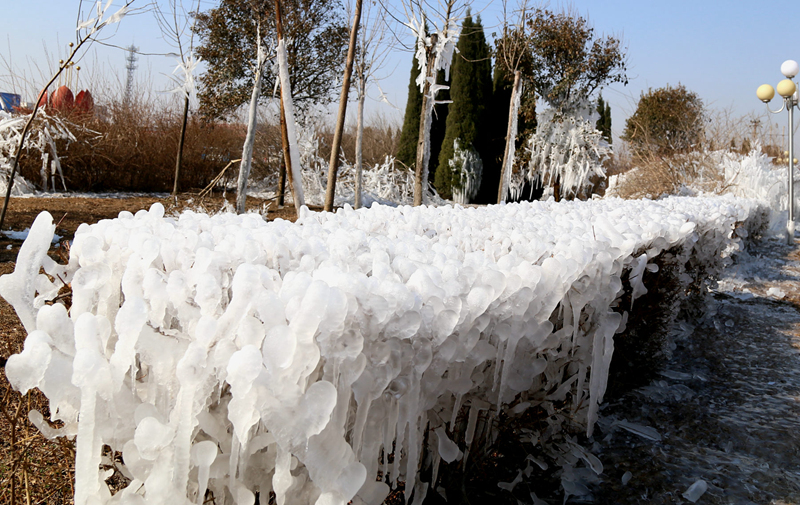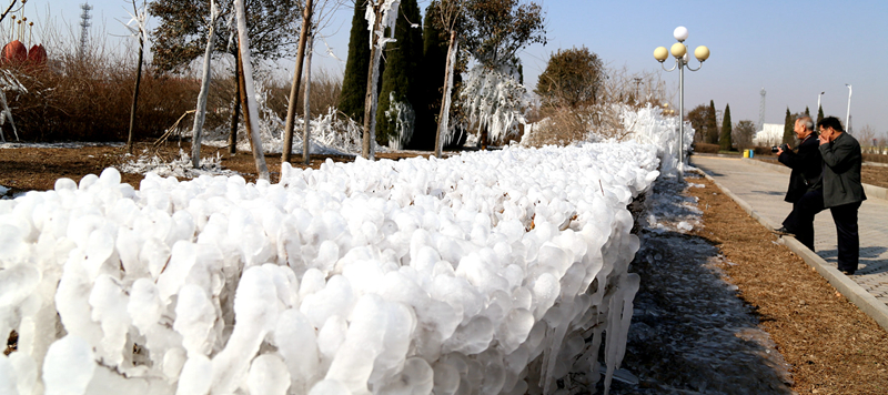 正月十九,垦利城南广场园林灌木旋转喷洒浇水,夜晚气温骤降形成巧夺天工的冰塑。十分美丽壮观。