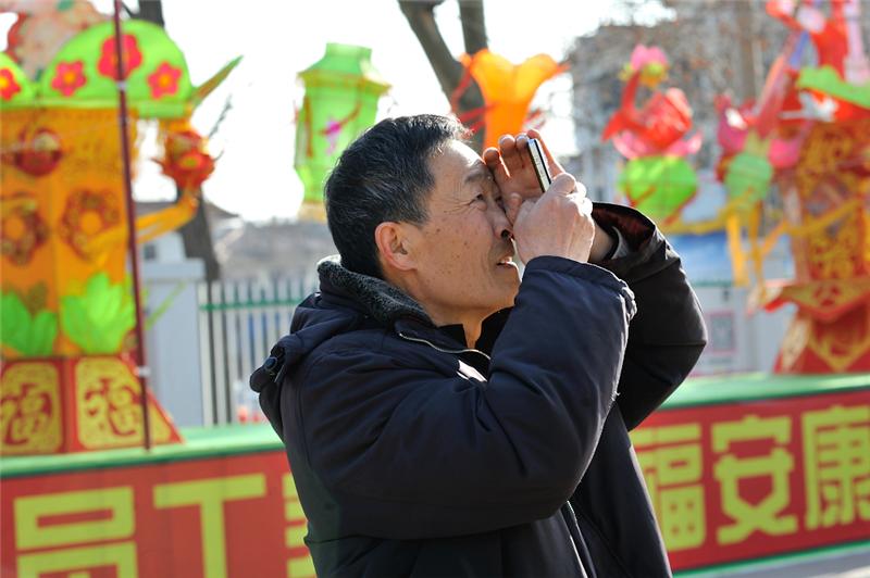 瞧,一老汉看的漂亮的花灯,住下脚步,不由的拿出手机也拍上一张。