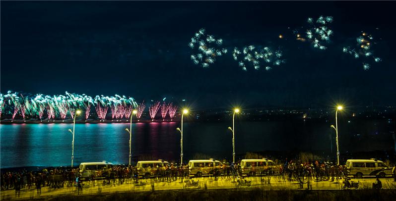 2015.3.4.晚,即墨市在石棚水库举办焰火晚会,以庆新春。为拍好片子,我事先三次采点,且早早地赶去;拍摄中主要采用了B门,并用黑板遮挡的方法,通过数次曝光,将几次拍摄的礼花横列式地排列在一张图片上。放焰火半小时,我大约成功抓拍了十几幅;这是其中一幅。