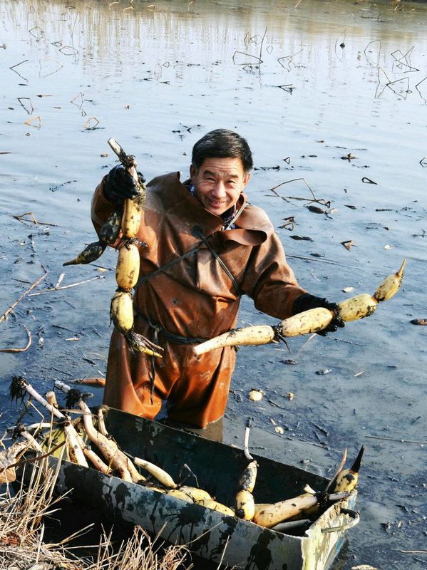 进入腊月,是马踏湖白莲藕的最佳收获期。连日来,地处马踏湖区——桓台县起凤镇的种藕人和踩藕高手们,顾不上刺骨的寒风,砸开冰封的湖面,开始一年来最快乐、最幸福的收获。夏二村种藕人田江承面对镜头兴奋地说,他种的8亩白莲藕已经开始大面积收获,新踩上来的白莲藕可以直接供应春节餐桌。(吴军 摄)