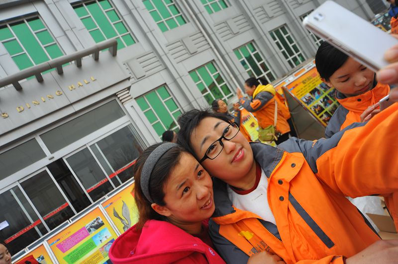 3.8节和学雷锋日来临之际,胜利油田举办大型公益活动,广征社会团体参与。麦田组织的队员没忙和之余不忘用手机记录着自己