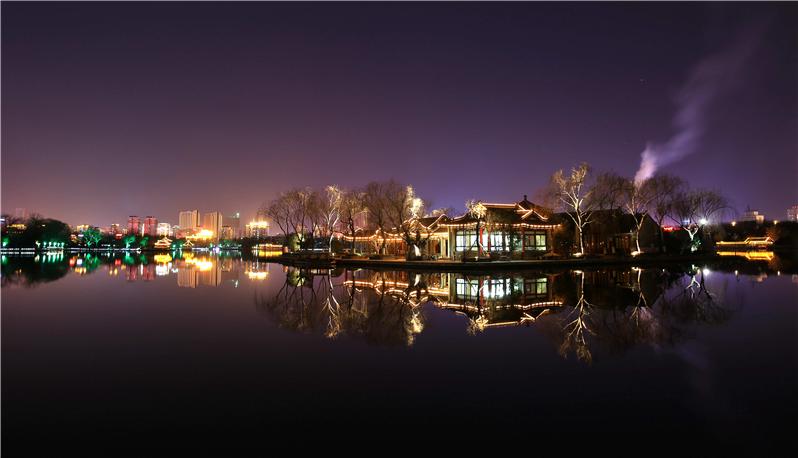 夜色降临,大明湖那如镜的湖面平静得出奇,竟然没有一丝丝的波纹,当历下亭的那一组组色彩斑斓的灯光不打一丝折扣的映入湖中时,远远看去,就像一对相拥的恋人那般,已是难舍难分……。