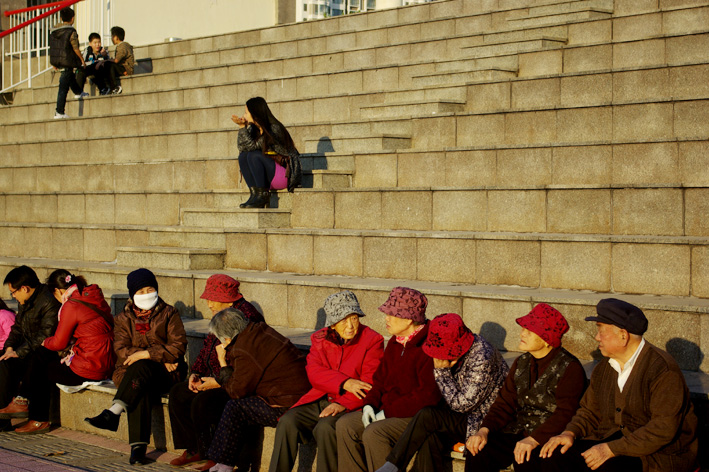 德州市政广场扫街,在台阶上看到三代人不同的服饰,不同的交流人群,感慨颇多!
