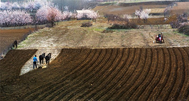 山东枣庄山区的春耕图。