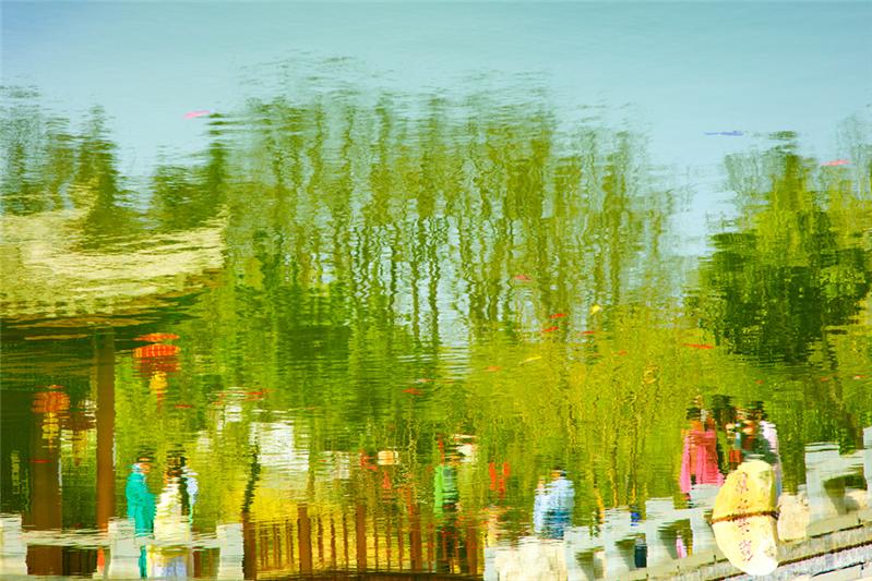 倒影中的亭台、人物使人恍惚回到了汉唐盛世,拍于烟台毓璜顶