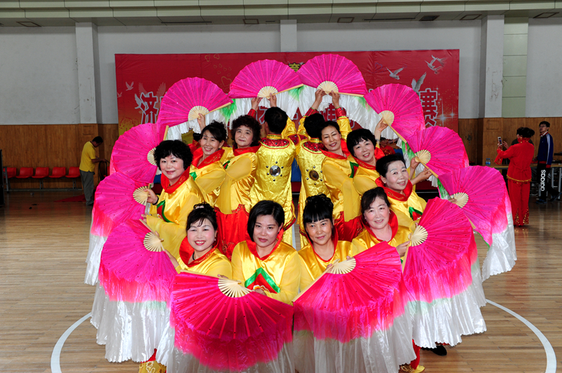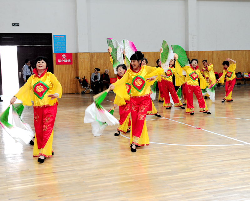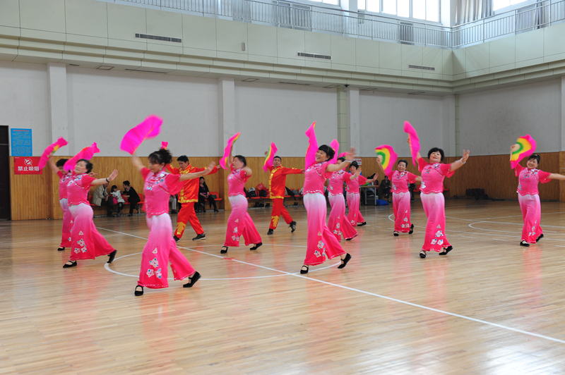 拍摄于2015.05.06日“济宁第五届老年人健身秧歌比赛”现场。这是邹电老年舞蹈艺术团在现场表演节目。